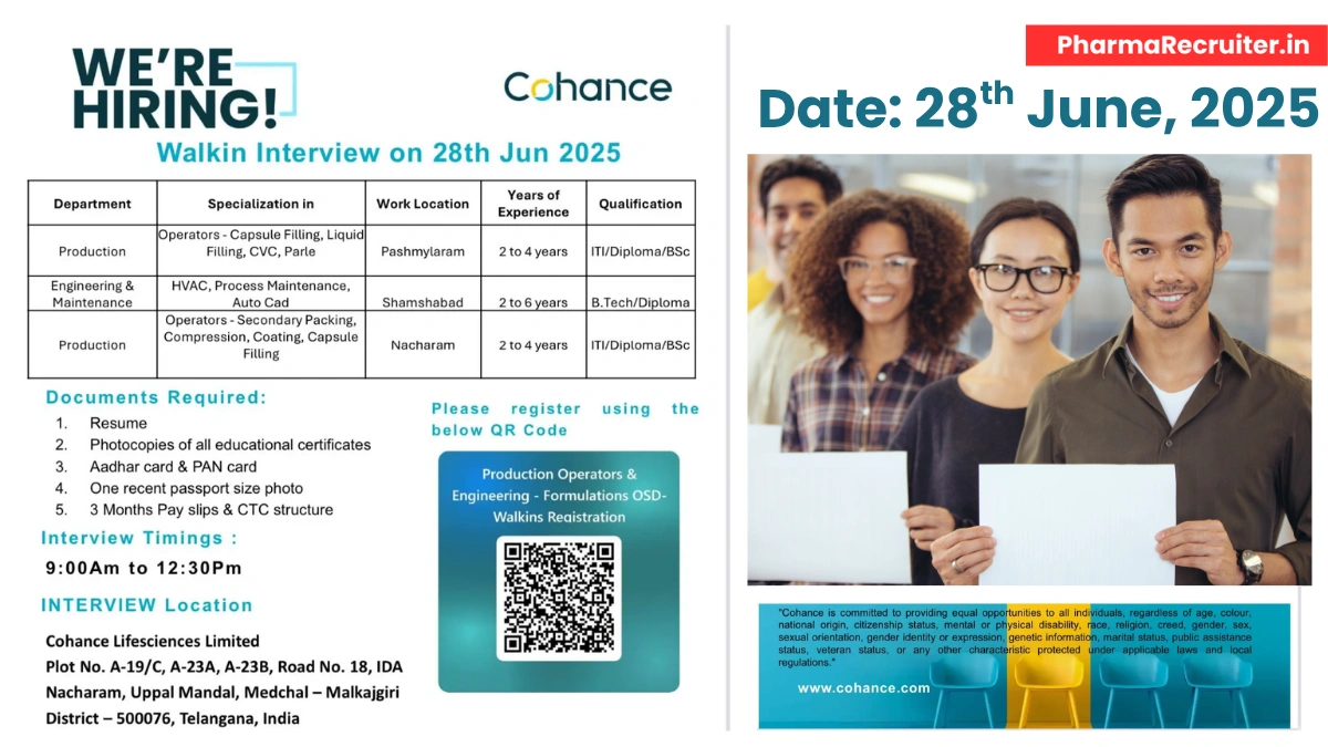 Cohance Lifesciences, a global leader in API and formulation manufacturing, invites skilled professionals to a walk-in interview on June 28, 2025, in Nacharam, Telangana. Join our US FDA-approved team to drive pharmaceutical excellence.