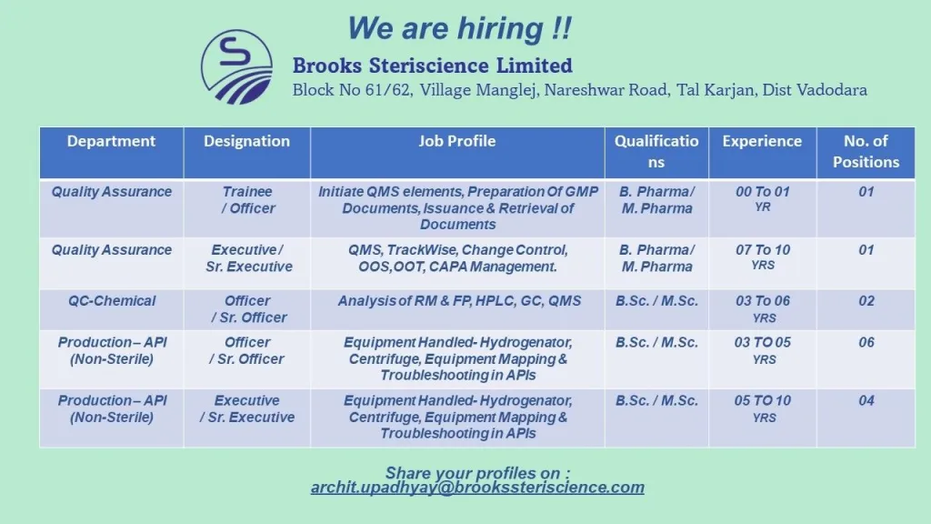 Are you ready to embark on a rewarding career journey with one of India’s most trusted pharmaceutical companies? Brooks Steriscience Limited has been at the forefront of healthcare for over 20 years, delivering high-quality and affordable healthcare solutions worldwide. With certifications from US-FDA, MHRA, EU-GMP, and WHO, we ensure our products meet the highest global standards. Our team is expanding, and we’re looking for talented individuals to join us in various departments.