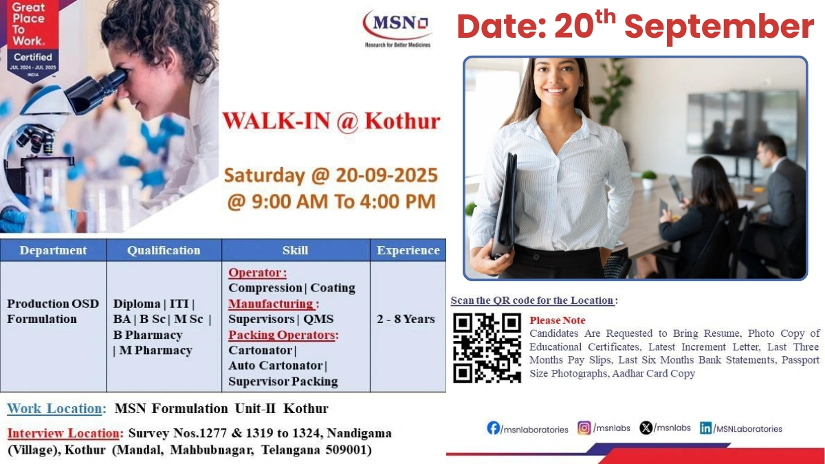 MSN Laboratories, a Great Place to Work certified company (Jul 2024–Jul 2025), invites passionate professionals to our walk-in drive. Discover exciting pharma careers in formulation manufacturing. Research for better medicines starts with us.