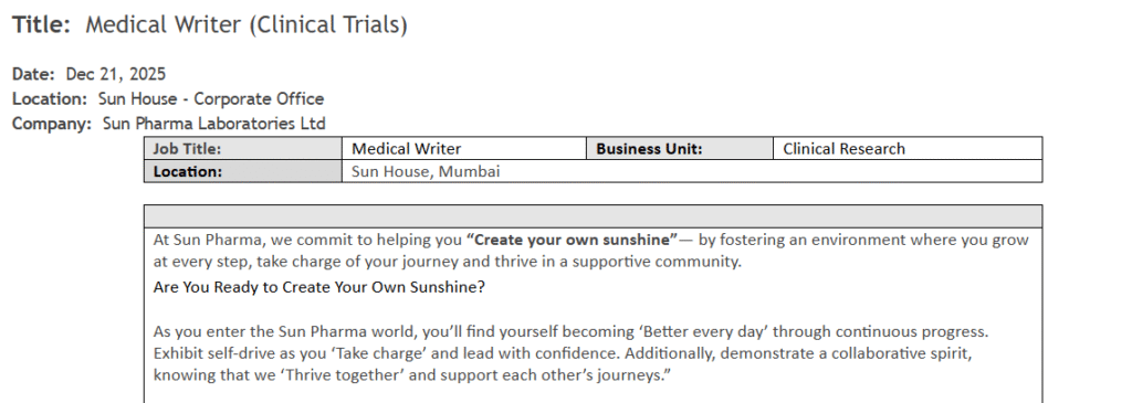 Explore latest pharma jobs at Sun Pharma – Regulatory Affairs Executive in Baroda and Medical Writer in Mumbai. Ideal for M.Pharm/M.Sc & MBBS professionals seeking pharmaceutical careers in India.